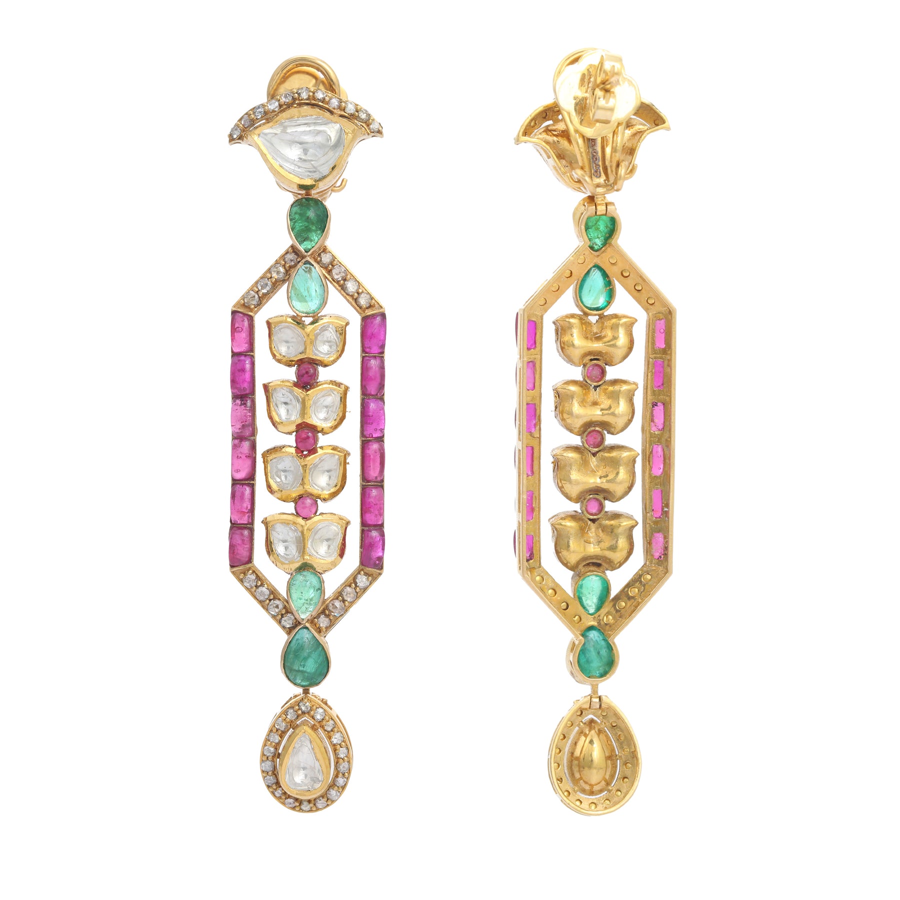 The Chandra Rekha Earrings draw inspiration from the elegance of moonlight — calm, constant, and composed. Crafted in gold with rows of pink tourmaline, emeralds, and uncut Polki diamonds, the design traces a vertical silhouette that feels both celestial and geometric. At the top, a crescent-like arc sets the tone, leading into a rhythmic cascade of shapes that resemble floral vines, temple pillars, or even a stylized rekha — a sacred line of beauty. Named Chandra Rekha, or “line of the moon,” these earrings balance structure with softness, colour with clarity — a luminous expression of quiet opulence.