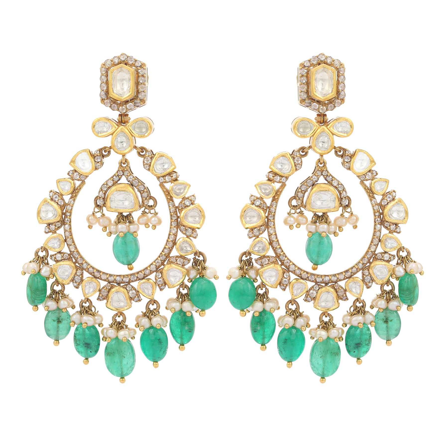 The Noorani Chaandbalis are designed to echo the quiet grandeur of a moonlit celebration — reflective, regal, and rich in heritage. Crafted in gold with Polki diamonds tracing a crescent arc, the earrings feature a floating inner drop, framed by pearls and finished with emerald beads that sway with every movement. The balance between sharp structure and delicate fluidity mirrors the interplay of tradition and opulence. Named Noorani, meaning “radiant with divine light,” these earrings are meant to dazzle not with excess, but with presence. Whether worn under the stars or in the glow of a celebration, they capture the essence of old-world charm with a luminous modern spirit.
