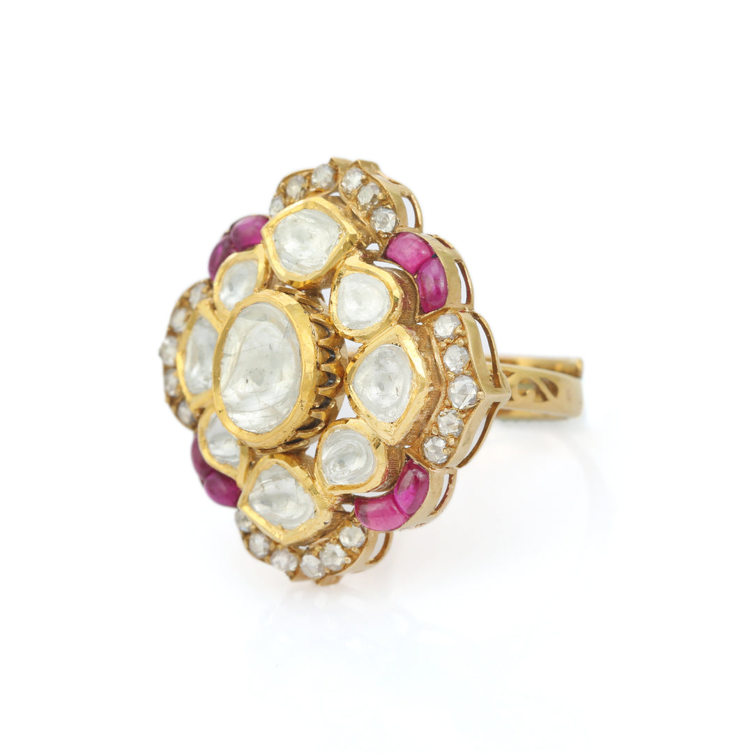 The Sitara Ring is a celestial ode to starlit Mughal nights. Its symmetrical layout, punctuated by diamond-polki clusters, resembles an ornate chhatri dome viewed from above—radiating royal geometry. The four crescent-like strokes of deep pink enamel embrace the central diamond like rising moons, invoking a cosmic rhythm. This interplay of soft curves, mirrored symmetry, and radiant stonework pays homage to vintage Mughal ceiling frescoes and palace inlays, where stars, flowers, and arches often merged in perfect balance. A ring that quietly commands attention—evoking both architecture and astronomy.