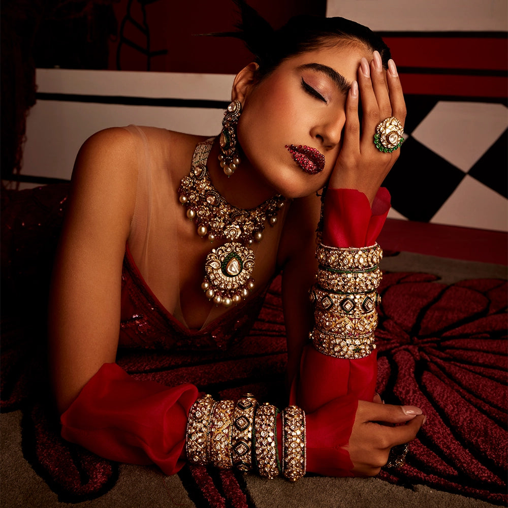 Feet prepared to take off on an unfamiliar ride. Mesmerized crowd waiting to celebrate the beautiful bride. Countless verses describe her beauty in several rhapsodies, as does our new collection, “Rouge Vanity.”