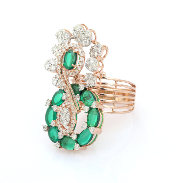 The Mayilraag Ring draws its essence from the ethereal plume of a peacock (Mayil), capturing the grandeur and grace of its fanned feathers in full bloom. The ring’s sweeping silhouette mimics the elegance of a dancing peacock, with oval emeralds representing the rich hues of its plumage, and pavé diamonds evoking the shimmer of dew settling on each feather. The circular forms loop fluidly like a rhythmic classical motif, transforming every curve into a celebration of nature's artistry and divine movement.